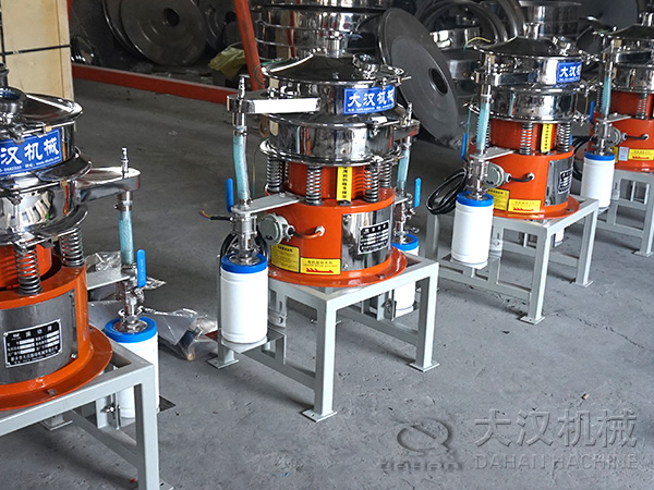 氣體保護(hù)振動篩是利用超聲波清網(wǎng)的原理,在原有圓形旋振篩的基礎(chǔ)上加裝氣體保護(hù)裝置,采用立式振動電機(jī)作為激振源,電機(jī)上、下兩端安裝有偏心重錘,將電機(jī)的旋轉(zhuǎn)運(yùn)動轉(zhuǎn)變?yōu)樗?、垂直、傾斜的三次元運(yùn)動,再把這個運(yùn)動傳遞給篩面,使超微細(xì)粉體接受巨大的超聲加速度,從而抑制粘附、摩擦、平降、楔入等堵網(wǎng)因素,提高篩分效率和清網(wǎng)效率。