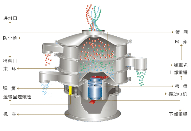 塑料振動(dòng)篩采用YZUL立式振動(dòng)電機(jī)作為激振源,通過振動(dòng)電機(jī)上下兩端的偏心重錘將旋轉(zhuǎn)運(yùn)動(dòng)轉(zhuǎn)變?yōu)樗?、垂直、傾斜的三次元運(yùn)動(dòng),并傳遞到旋振篩的篩面上;物料通過入料口進(jìn)入設(shè)備內(nèi),根據(jù)不同物料篩分要求,物料經(jīng)過1-5層采用不同目數(shù)的金屬編織篩網(wǎng)的篩分層,在這個(gè)過程中,位于各層的篩網(wǎng)下的清網(wǎng)裝置通過頻率振動(dòng)不斷撞擊不銹鋼篩網(wǎng),使篩網(wǎng)上層物料能夠順暢的透網(wǎng)篩分,并有效解決了物料堵網(wǎng)問題出現(xiàn),不同目數(shù)的物料通過各層對應(yīng)目數(shù)的篩網(wǎng)后在各層的出料口排出,終實(shí)現(xiàn)篩選除雜或過濾分級(jí)的目的。