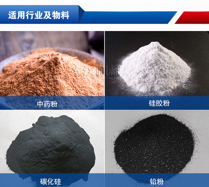 冶金行業(yè):磁性材料、鈷粉、粉煤灰、錫粉、矽粉、鉛粉、鋅氧粉、金剛粉、鋁粉、鐵粉等粉末類物料。