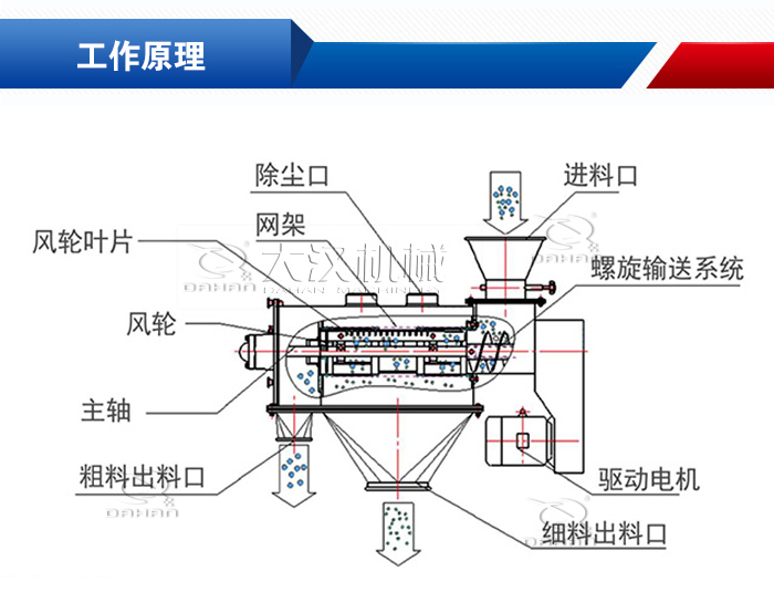 臥式氣流篩結(jié)構(gòu):振動(dòng)電機(jī)、機(jī)座、篩箱、進(jìn)出料推進(jìn)裝置等。其篩網(wǎng)為圓筒狀,置于機(jī)體內(nèi),物料通過(guò)螺旋輸送系統(tǒng)后,和氣流混合、霧化進(jìn)入氣流篩分機(jī)網(wǎng)筒內(nèi)部,再通過(guò)網(wǎng)筒內(nèi)部的風(fēng)輪葉片使物料同時(shí)受到離心力和旋風(fēng)推進(jìn)力,從而迫使物料噴射過(guò)網(wǎng),由細(xì)料排出口排出,不能過(guò)網(wǎng)的物料沿著網(wǎng)筒壁從粗料排出口排出。