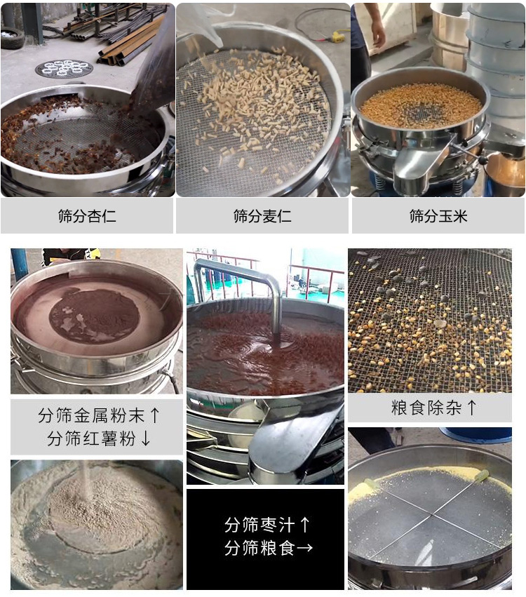 杏仁旋振篩與杏仁接觸部分采用304食品不銹鋼材質(zhì),用于去除和杏仁混在一起的杏仁殼以及砸核過(guò)程中被壓碎的碎果仁。