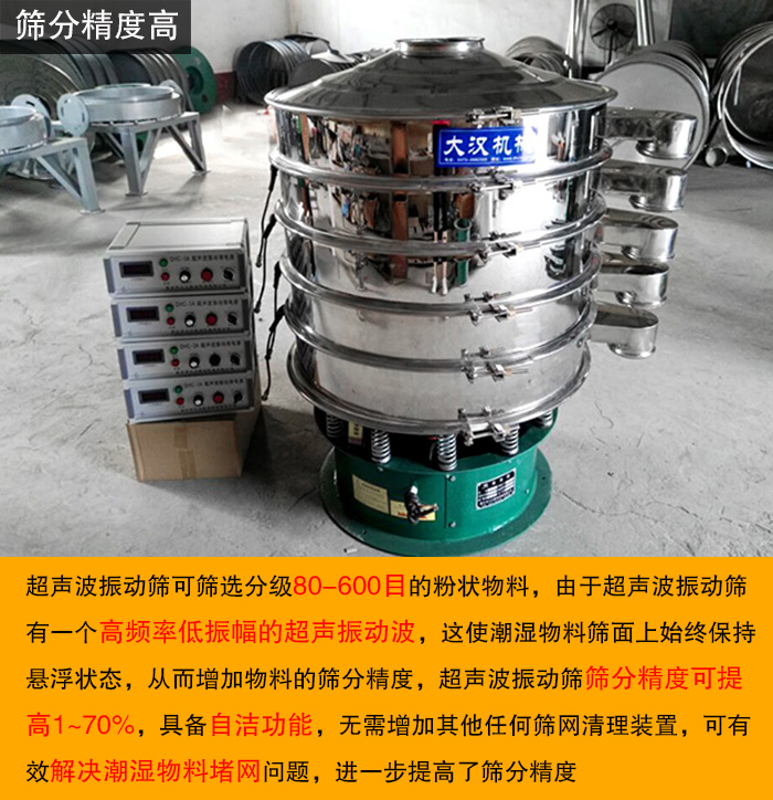 超聲波振動篩可篩選分級80-600目的粉狀物料,由于超聲波振動篩有一個高頻率低振幅的超聲振動波,這使潮濕物料篩面上始終保持懸浮狀態(tài),從而增加物料的篩分精度,超聲波振動篩篩分精度可提高1~70%,具備自潔功能,無需增加其他篩網(wǎng)清理裝置,可有效解決潮濕物料堵網(wǎng)問題,進(jìn)一步提高了篩分精度。