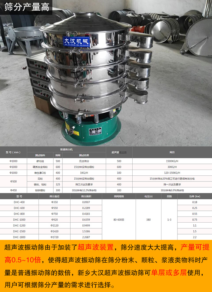 超聲波振動篩由于加裝了超聲波裝置,篩分速度大大提高,產(chǎn)量可提高0.5~10倍,使得超聲波振動篩在篩分粉末、顆粒、漿液類物料時(shí)產(chǎn)量是普通振動篩的數(shù)倍,新鄉(xiāng)大漢超聲波振動篩可單層或多層使用,用戶可根據(jù)篩分產(chǎn)量的需求進(jìn)行選擇。