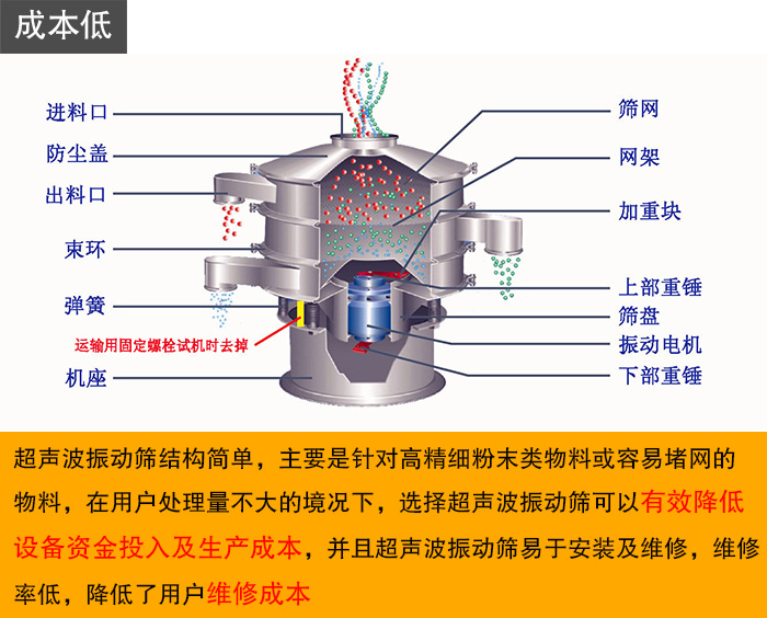超聲波振動篩結(jié)構(gòu)簡單,主要是針對高精細(xì)粉末類物料或容易堵網(wǎng)的物料,在用戶處理量不大的境況下,選擇超聲波振動篩可以有效降低設(shè)備資金投入及生產(chǎn)成本,并且超聲波振動篩易于安裝及維修,維修率低,降低了用戶維修成本。