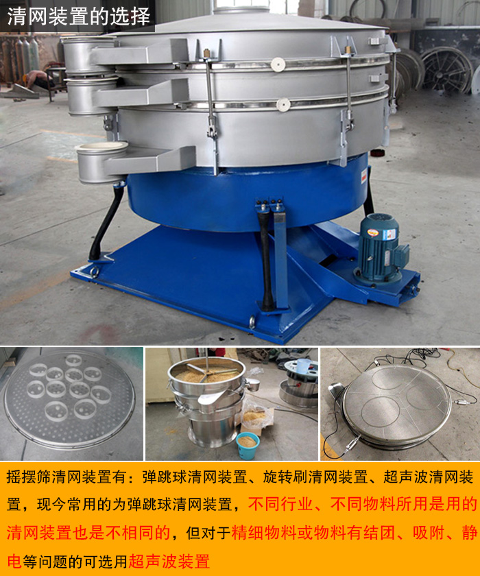 搖擺篩清網(wǎng)裝置有:彈跳球清網(wǎng)裝置、旋轉(zhuǎn)刷清網(wǎng)裝置、超聲波清網(wǎng)裝置,現(xiàn)今常用的為彈跳球清網(wǎng)裝置,不同行業(yè)、不同物料所用是用的清網(wǎng)裝置也是不相同的,但對于精細物料或物料有結(jié)團、吸附、靜電等問題的可選用超聲波裝置。