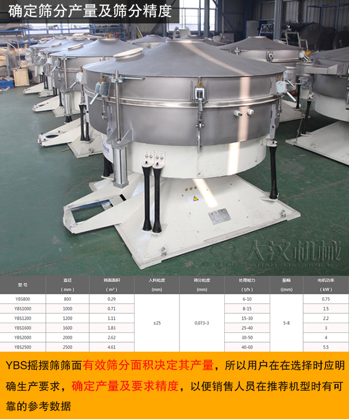 YBS搖擺篩篩面有效篩分面積決定其產(chǎn)量,所以用戶在在選擇時應(yīng)明確生產(chǎn)要求,確定產(chǎn)量及要求精度,以便銷售人員在推薦機型時有可靠的參考數(shù)據(jù)。