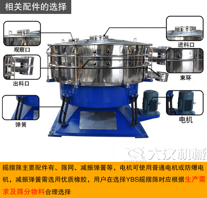 搖擺篩主要配件有電機、篩網(wǎng)、減振彈簧等,電機可使用普通電機或防爆電機,減振彈簧需選用優(yōu)質(zhì)橡膠,用戶在選擇YBS搖擺篩時應(yīng)根據(jù)生產(chǎn)需求及篩分物料合理選擇。