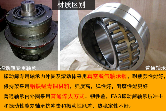 普通軸承內(nèi)外圈采用普通淬火方式,韌性差,F(xiàn)AG振動(dòng)篩軸承抗沖擊和振動(dòng)性能差軸承抗沖擊和振動(dòng)性能差,熱穩(wěn)定性不好。