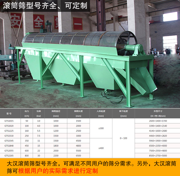 新鄉(xiāng)大漢滾筒篩型號(hào)有GTS1015、GTS1020、GTS1225、GTS1530、GTS1545、GTS1848、GTS2055、GTS2265等。不同型號(hào)的滾筒篩,其處理能力是不同的,大漢滾筒篩型號(hào)齊全,可滿足不同用戶的篩分需求。另外,大漢滾筒篩可根據(jù)用戶的實(shí)際需求進(jìn)行定制。