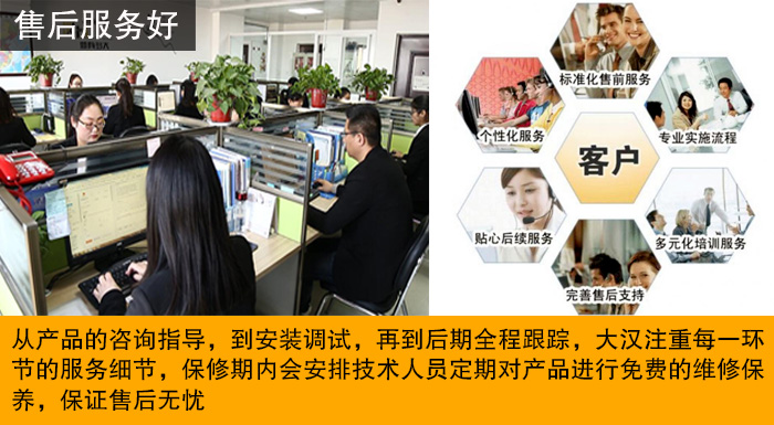 大漢公司采用一站式服務(wù)體系,從產(chǎn)品的咨詢指導(dǎo),到安裝調(diào)試,再到后期全程跟蹤,大漢注重每一環(huán)節(jié)的服務(wù)細(xì)節(jié),致力于為客戶解決一切疑難問題,保修期內(nèi)會(huì)安排技術(shù)人員定期對產(chǎn)品進(jìn)行免費(fèi)的維修保養(yǎng),保證售后無憂。