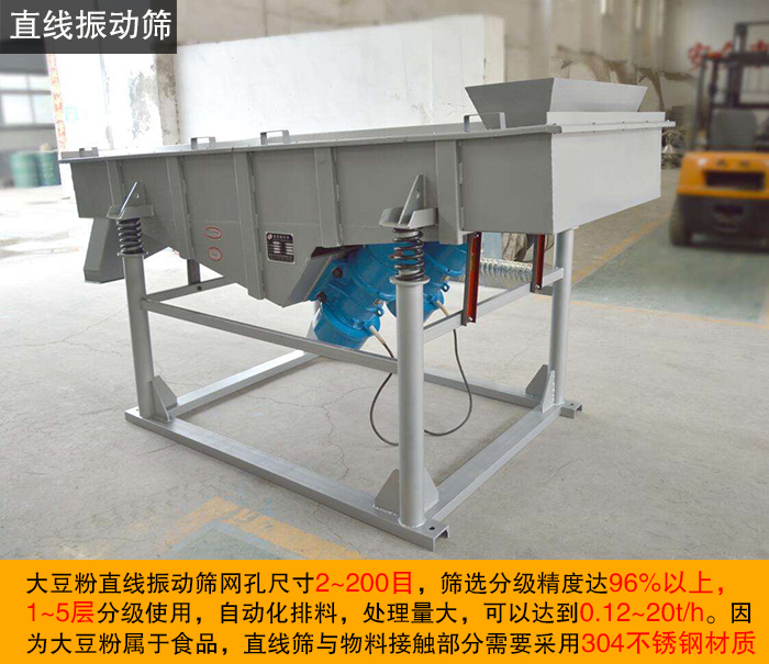 大豆粉直線振動篩網(wǎng)孔尺寸2~200目,篩選分級精度達(dá)96%以上,1~5層分級使用,自動化排料,處理量大,可以達(dá)到0.12~20t/h。因?yàn)榇蠖狗蹖儆谑称罚本€篩與物料接觸部分需要采用304不銹鋼材質(zhì)。
