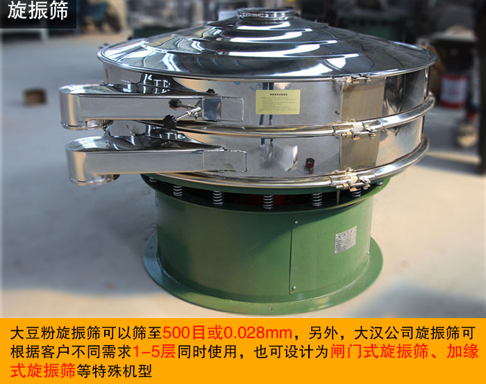 大豆粉旋振篩可以篩至500目或0.028mm,另外,大漢公司旋振篩可根據(jù)客戶不同需求1-5層同時使用,生產(chǎn)的旋振篩從篩面直徑600-2000mm、304不銹及碳鋼材質(zhì)等各種型號齊全,用于大豆粉篩分的旋振篩好采用304不銹鋼材質(zhì),可滿足各種粉末、顆粒篩分需要求及液體過濾需求,也可設(shè)計(jì)為閘門式旋振篩、加緣式旋振篩等特殊機(jī)型。