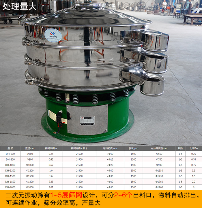 三次元振動篩有1~5層篩網(wǎng)設(shè)計(jì),可分2~6個(gè)出料口,物料自動排出,可連續(xù)作業(yè),篩分效率高,產(chǎn)量大,可滿足不同用戶對調(diào)味品產(chǎn)量的要求。
