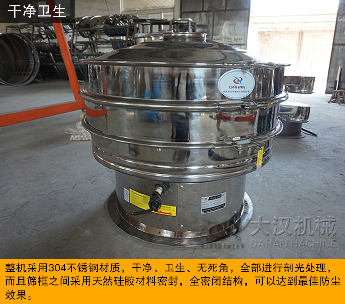 不銹鋼振動(dòng)篩整機(jī)采用304不銹鋼材質(zhì),干凈、衛(wèi)生、無(wú)死角,全部進(jìn)行剖光處理,完全達(dá)到食品衛(wèi)生標(biāo)準(zhǔn),符合奶粉篩分行業(yè)的需求。而且篩框之間采用天然硅膠材料密封,全密閉結(jié)構(gòu),從而達(dá)到防塵效果。
