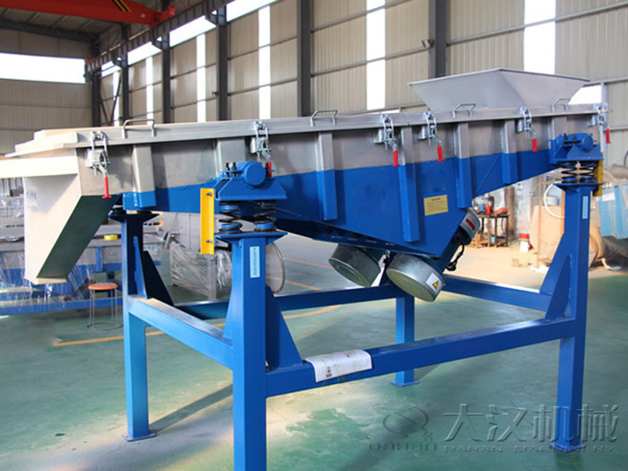 直線振動篩利用振動電機作為振動源,當(dāng)兩臺振動電機做同步或反向旋轉(zhuǎn)時,其偏心塊所產(chǎn)生的激振力在平行于電機軸線的方向上相互抵消,在垂直于電機軸的方向疊為一合力,其兩電機軸相對篩面有一傾角,在激振力和面粉自身重力的合力作用下,面粉在篩面上被拋起向前作直線運動,從而完成對面粉的篩選和分級。