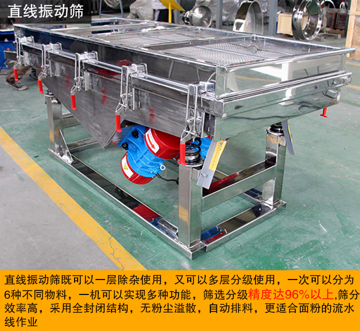 直線振動篩既可以一層除雜使用,又可以多層分級使用,一次可以分為6種不同物料,一機可以實現(xiàn)多種功能,篩選分級精度達(dá)96%以上,篩分效率高,采用全封閉結(jié)構(gòu),無粉塵溢散,自動排料,更適合面粉的流水線作業(yè)。