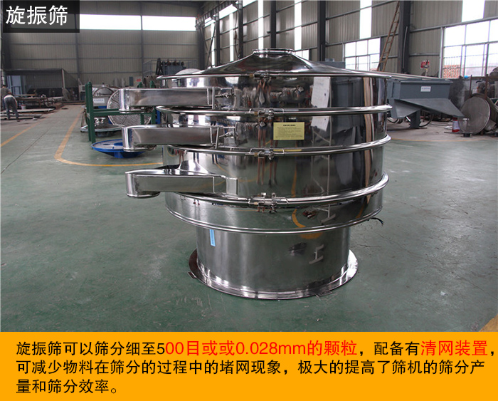 旋振篩可以篩分細(xì)至500目或或0.028mm的顆粒,配備有清網(wǎng)裝置,可減少物料在篩分的過程中的堵網(wǎng)現(xiàn)象,極大的提高了篩機的篩分產(chǎn)量和篩分效率。