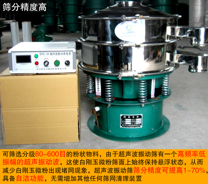 超聲波振動(dòng)篩可篩選分級(jí)80-600目的粉狀物料,由于超聲波振動(dòng)篩有一個(gè)高頻率低振幅的超聲振動(dòng)波,這使白剛玉微粉篩面上始終保持懸浮狀態(tài),從而減少白剛玉微粉出現(xiàn)堵網(wǎng)現(xiàn)象,超聲波振動(dòng)篩篩分精度可提高1~70%,具備自潔功能,無需增加其他篩網(wǎng)清理裝置,進(jìn)一步提高了篩分精度。