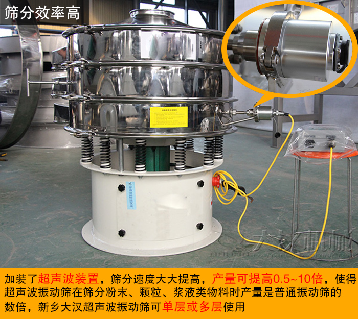 超聲波振動(dòng)篩由于加裝了超聲波裝置,篩分速度大大提高,產(chǎn)量可提高0.5~10倍,使得超聲波振動(dòng)篩在篩分粉末、顆粒、漿液類物料時(shí)產(chǎn)量是普通振動(dòng)篩的數(shù)倍,新鄉(xiāng)大漢超聲波振動(dòng)篩可單層或多層使用,用戶可根據(jù)篩分產(chǎn)量的需求進(jìn)行選擇。