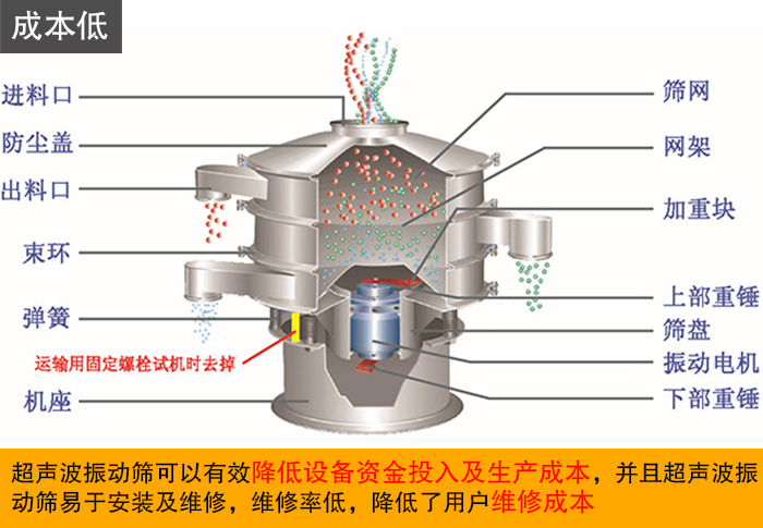 超聲波振動(dòng)篩結(jié)構(gòu)簡(jiǎn)單,主要是針對(duì)高精細(xì)粉末類物料或容易堵網(wǎng)的物料,在用戶處理量不大的境況下,選擇超聲波振動(dòng)篩可以有效降低設(shè)備資金投入及生產(chǎn)成本,并且超聲波振動(dòng)篩易于安裝及維修,維修率低,降低了用戶維修成本。