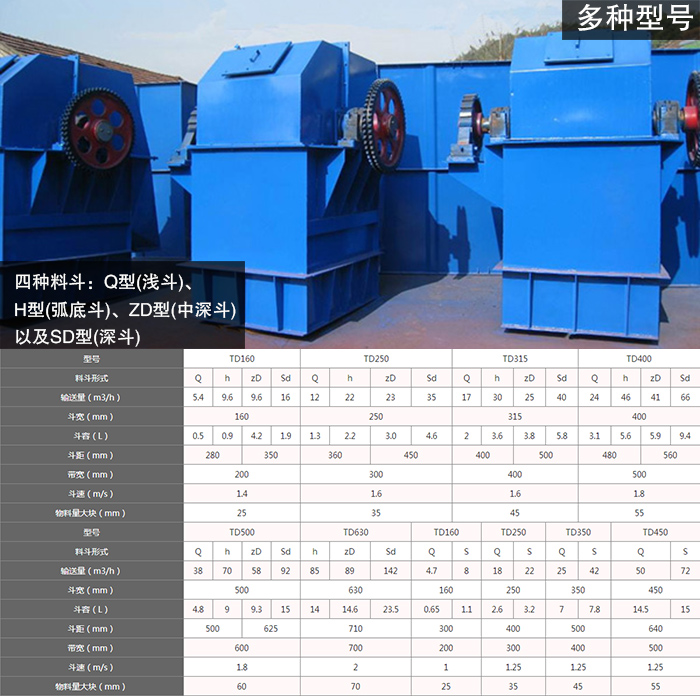 大漢td斗式提升機(jī)型號(hào)包括td160斗式提升機(jī)、td250斗式提升機(jī)、td315斗式提升機(jī)、td400斗式提升機(jī),且TD型斗式提升機(jī)備有四種料斗:Q型(淺斗)、H型(弧底斗)、ZD型(中深斗)以及SD型(深斗)。不同型號(hào)、不同料斗的td斗式提升機(jī)輸送量是不同的,可以滿足用戶的更多要求。