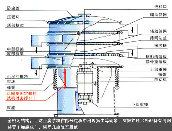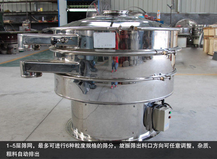 旋振篩采用立式振動(dòng)電機(jī)作為激振源,通過(guò)振動(dòng)電機(jī)上下兩端的偏心重錘將旋轉(zhuǎn)運(yùn)動(dòng)轉(zhuǎn)變?yōu)樗?、垂直、傾斜的三次元運(yùn)動(dòng),并傳遞到旋振篩的篩面上,魔芋粉通過(guò)入料口進(jìn)入設(shè)備內(nèi),根據(jù)不同的篩分要求,魔芋粉經(jīng)過(guò)1-5層不同目數(shù)的篩網(wǎng)的篩分層,在這個(gè)過(guò)程中,位于各層的篩網(wǎng)下的清網(wǎng)裝置不斷撞擊篩網(wǎng),使魔芋粉能夠順暢的篩分,并有效避免魔芋粉堵網(wǎng)問(wèn)題的出現(xiàn),不同目數(shù)的魔芋粉通過(guò)各層對(duì)應(yīng)目數(shù)的篩網(wǎng)或經(jīng)設(shè)置在各層的出料口排出,終實(shí)現(xiàn)對(duì)魔芋粉的篩選或過(guò)濾。