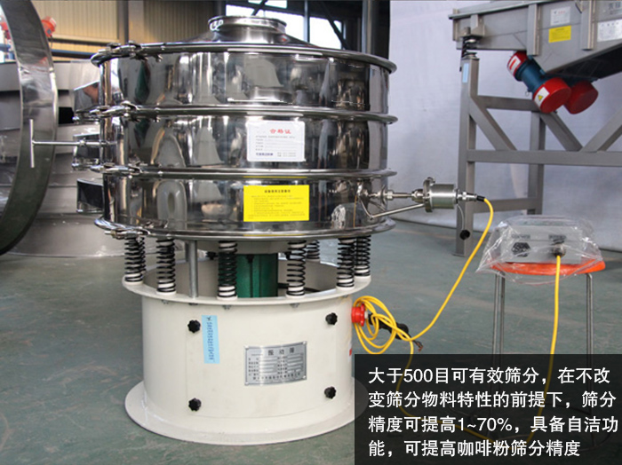 大漢超聲波振動(dòng)篩大于500目可有效篩分,在不改變篩分物料特性的前提下,篩分精度可提高1~70%,可以有效保證咖啡粉的篩分精度。而且,由于超聲波振動(dòng)篩加裝了超聲波篩分系統(tǒng),從而具備自潔功能,無(wú)需增加其他篩網(wǎng)清理裝置,進(jìn)一步提高了咖啡粉的篩分精度。