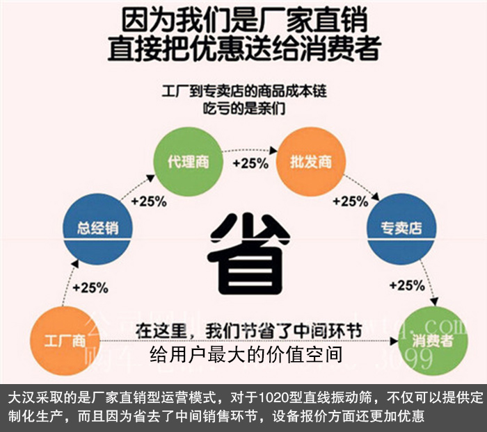 大漢采取的是廠家直銷型運(yùn)營模式,對(duì)于1020型直線振動(dòng)篩,不僅可以提供定制化生產(chǎn),而且因?yàn)槭∪チ酥虚g銷售環(huán)節(jié),設(shè)備報(bào)價(jià)方面還更加優(yōu)惠,保證讓您以較低的價(jià)格購得滿意的直線振動(dòng)篩設(shè)備。