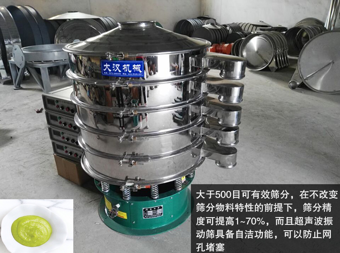 超聲波振動篩大于500目可有效篩分,在不改變篩分物料特性的前提下,篩分精度可提高1~70%,而且超聲波振動篩具備自潔功能,無需增加的清網(wǎng)裝置,既可以防止網(wǎng)孔堵塞,又可以提高芥末粉的篩分精度。