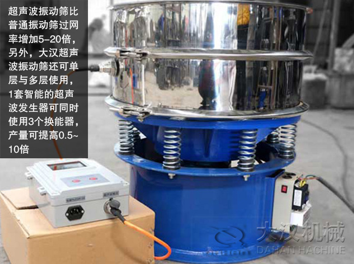 超聲波振動篩可有效分解粘附物質(zhì),減少篩上物,比普通振動篩過網(wǎng)率增加5-20倍,另外,大漢超聲波振動篩還可單層與多層使用,1套智能的超聲波發(fā)生器可同時使用3個換能器,產(chǎn)量可提高0.5~10倍。