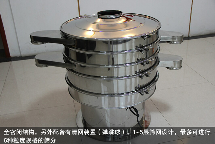 食品振動篩采用全密閉結(jié)構(gòu),另外配備有清網(wǎng)裝置(彈跳球),1~5層篩網(wǎng)設(shè)計,多可進行6種粒度規(guī)格的篩分,可進行連續(xù)化作業(yè),篩分效率高。