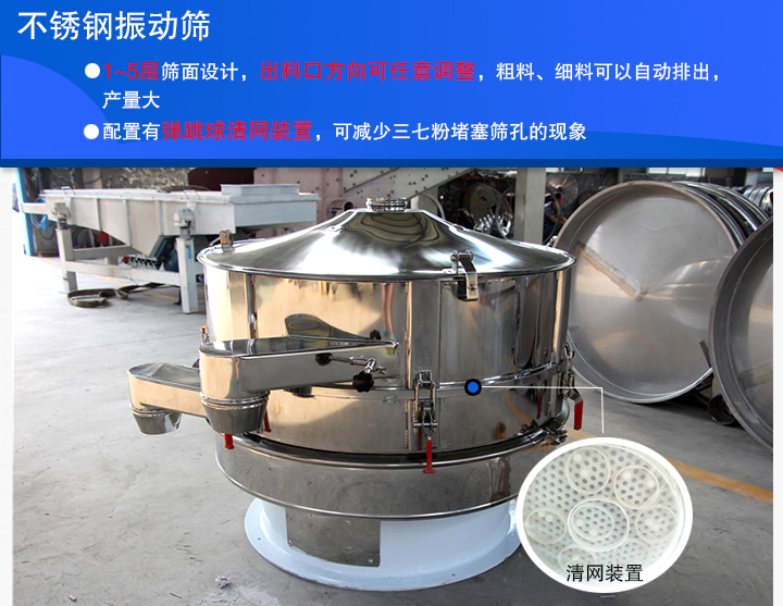 不銹鋼振動篩1~5層篩面設(shè)計,出料口方向可任意調(diào)整,粗料、細(xì)料可以自動排出,產(chǎn)量大。另外,不銹鋼振動篩還配置有彈跳球清網(wǎng)裝置,可減少三七粉堵塞篩孔的現(xiàn)象,進(jìn)一步提高了其篩分效率。