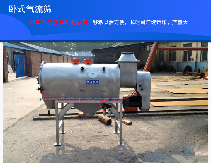臥式氣流篩可單機(jī)或多機(jī)配套使用,移動靈活方便,長時間連續(xù)運(yùn)作,產(chǎn)量大。