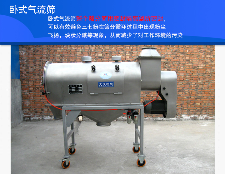 臥式氣流篩整個篩分筒用密封隔離罩所密封,可以有效避免三七粉在篩分循環(huán)過程中出現(xiàn)粉塵飛揚(yáng),塊狀分濺等現(xiàn)象,從而減少了對工作環(huán)境的污染。