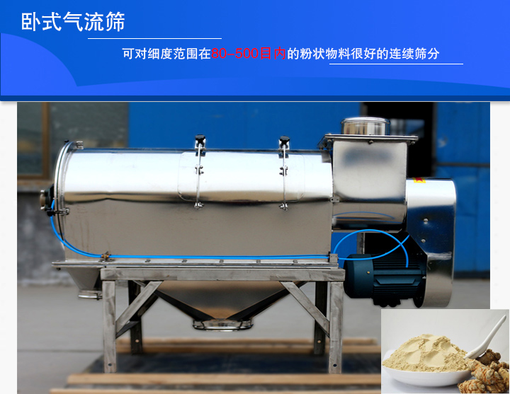 臥式氣流篩可對細(xì)度范圍在80-500目內(nèi)的粉狀物料很好的連續(xù)篩分。