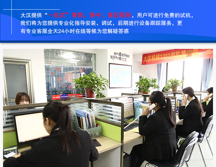 用戶滿意是大漢永恒的追求,大漢提供“一站式”售前、售中、售后服務(wù),用戶可進(jìn)行免費(fèi)的試機(jī),我們將為您提供專業(yè)化指導(dǎo)安裝、調(diào)試,后期進(jìn)行設(shè)備跟蹤服務(wù),更有專業(yè)客服全天24小時(shí)在線等候?yàn)槟庖纱鸹?,以便更加及時(shí)的響應(yīng)用戶。