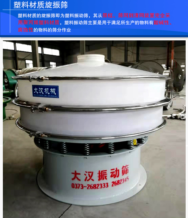 塑料材質(zhì)的旋振篩即為塑料振動篩,其從篩框、篩網(wǎng)到清網(wǎng)裝置完全采用聚丙烯塑料材質(zhì),塑料振動篩主要是用于滿足所生產(chǎn)的物料有酸堿性、腐蝕性的物料的篩分作業(yè),排除了一些特殊物料與金屬接觸會產(chǎn)生化學反應的問題。