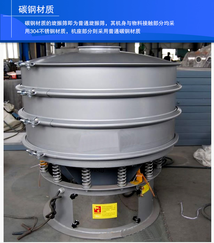 碳鋼材質(zhì)的旋振篩即為普通旋振篩,其機身與物料接觸部分均采用304不銹鋼材質(zhì),機座部分則采用普通碳鋼材質(zhì)。旋振篩可以篩分500目或或0.028mm的顆粒,過濾500目漿液。