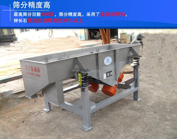 直線振動篩高篩分目數(shù)400目,篩分精度高,采用了全密閉結(jié)構(gòu),鉀長石篩選分級精度達96%以上。