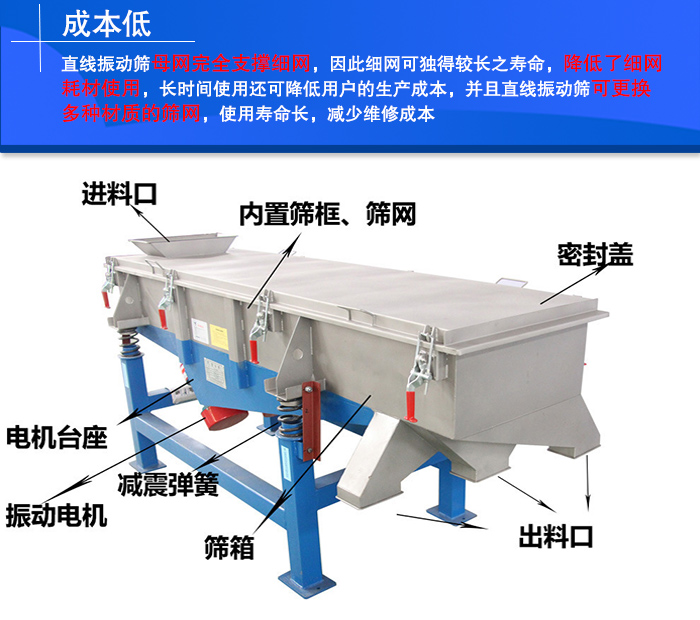 直線振動篩母網(wǎng)完全支撐細網(wǎng),因此細網(wǎng)可獨得較長之壽命,降低了細網(wǎng)耗材使用,長時間使用還可降低用戶的生產(chǎn)成本,并且直線振動篩可更換多種材質(zhì)的篩網(wǎng),使用壽命長,可以減少更換周期,從而進一步降低用戶的生產(chǎn)成本。