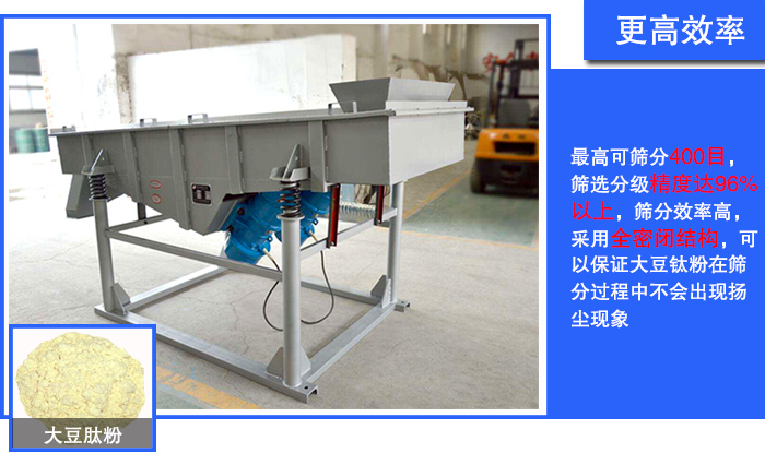 直線振動(dòng)篩高可篩分400目,篩選分級(jí)精度達(dá)96%以上,篩分效率高,采用全密閉結(jié)構(gòu),可以保證大豆鈦粉在篩分過程中不會(huì)出現(xiàn)揚(yáng)塵現(xiàn)象,進(jìn)一步提高篩分精度和效率。