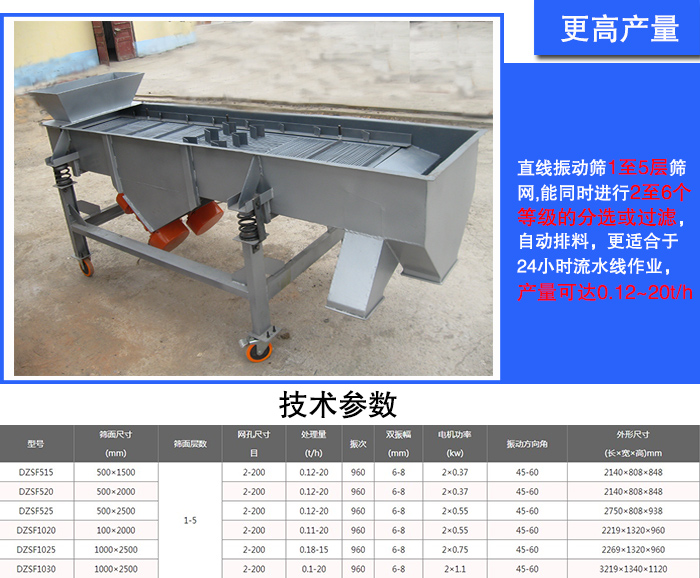 直線振動(dòng)篩1至5層篩網(wǎng),能同時(shí)進(jìn)行2至6個(gè)等級(jí)的分選或過濾,自動(dòng)排料,更適合于24小時(shí)流水線作業(yè),產(chǎn)量可達(dá)0.12~20t/h。