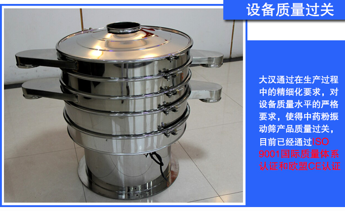 新鄉(xiāng)大漢創(chuàng)立20多年以來始終堅信:只有過硬的產(chǎn)品質(zhì)量才能讓企業(yè)贏得市場,只有過硬的產(chǎn)品質(zhì)量才能讓企業(yè)獲得更好的效益,也只有過硬的產(chǎn)品質(zhì)量才能實現(xiàn)企業(yè)的可持續(xù)發(fā)展。大漢通過在生產(chǎn)過程中的精細化要求,對設(shè)備質(zhì)量水平的嚴格要求,使得中藥粉振動篩產(chǎn)品質(zhì)量過關(guān),目前已經(jīng)通過ISO9001國際質(zhì)量體系認證和歐盟CE認證。