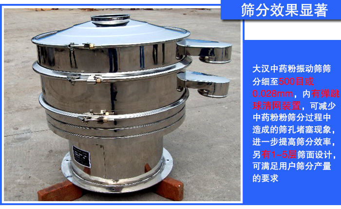 用于中藥粉篩分的設(shè)備,對其篩分精度要求是非常高的,需要達到好的篩分效果,大漢中藥粉振動篩篩分細至500目或0.028mm,內(nèi)有彈跳球清網(wǎng)裝置,可減少中藥粉粉篩分過程中造成的篩孔堵塞現(xiàn)象,進一步提高篩分效率,另有1~5層篩面設(shè)計,可滿足用戶篩分產(chǎn)量的要求。