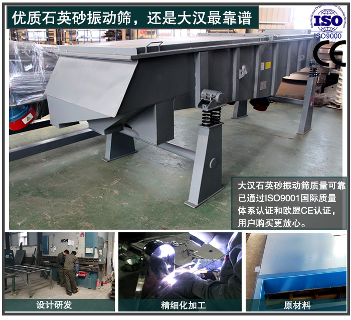 新鄉(xiāng)大漢作為一家擁有20多年生產(chǎn)經(jīng)驗(yàn)的振動(dòng)篩廠家,設(shè)備配置先進(jìn),生產(chǎn)經(jīng)驗(yàn)豐富,在產(chǎn)品的設(shè)計(jì)、技術(shù)、工藝及選材等方面時(shí)刻將質(zhì)量放在首位,不因利潤(rùn)的誘惑而放棄對(duì)質(zhì)量的追求,大漢石英砂振動(dòng)篩質(zhì)量可靠,已通過ISO9001國(guó)際質(zhì)量體系認(rèn)證和歐盟CE認(rèn)證,用戶購(gòu)買更放心。