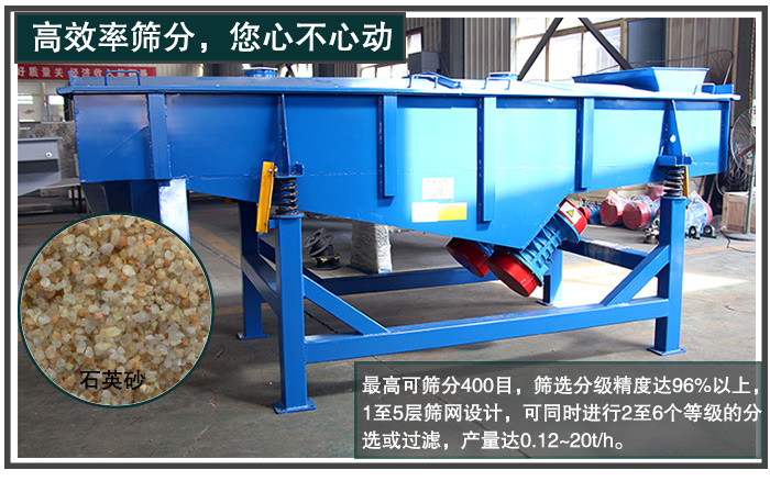大漢石英砂振動(dòng)篩篩分高效,高可篩分400目,篩選分級(jí)精度達(dá)96%以上,1至5層篩網(wǎng)設(shè)計(jì),可同時(shí)進(jìn)行2至6個(gè)等級(jí)的分選或過濾,產(chǎn)量達(dá)0.12~20t/h,用戶使用更安心。