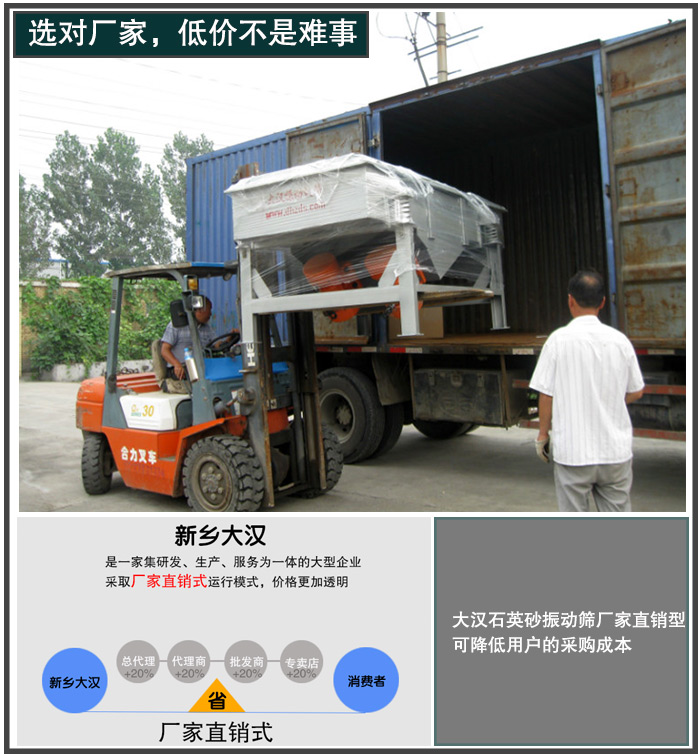 新鄉(xiāng)大漢是一家廠家直銷型企業(yè),生產(chǎn)的石英砂振動(dòng)篩均為低的出廠價(jià)格,可降低用戶的采購(gòu)成本,用戶購(gòu)買更舒心