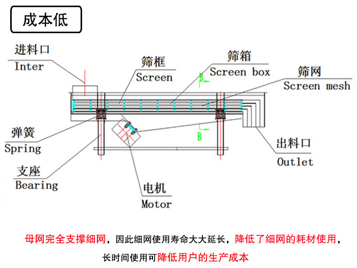 直線振動(dòng)篩采用了獨(dú)特的篩網(wǎng)結(jié)構(gòu)設(shè)計(jì),其母網(wǎng)完全支撐細(xì)網(wǎng),因此細(xì)網(wǎng)使用壽命大大延長,降低了細(xì)網(wǎng)的耗材使用,長時(shí)間使用可降低用戶的生產(chǎn)成本。而且用戶更換篩網(wǎng)更加方便快捷,只需3-5分鐘,并且篩機(jī)設(shè)計(jì)合理,精巧和容易裝配,一人即可操作篩機(jī),既可以節(jié)省客戶時(shí)間,又減少了人工勞動(dòng)力。