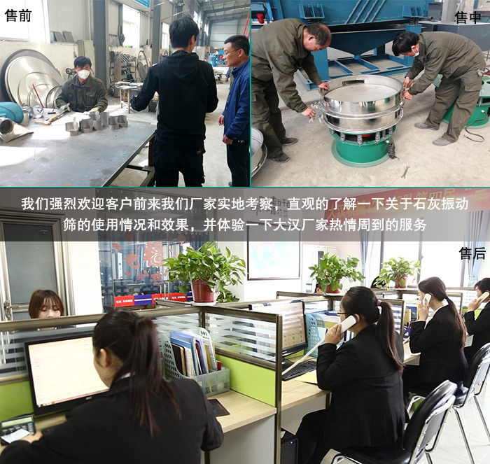 新鄉(xiāng)大漢擁有一系列完善的售前,售中,售后服務(wù)體系,實(shí)現(xiàn)與用戶的高效對(duì)接,此外,我們強(qiáng)烈歡迎客戶前來(lái)我們廠家實(shí)地考察,直觀的了解一下關(guān)于石灰振動(dòng)篩的使用情況和效果,并體驗(yàn)一下大漢廠家熱情周到的服務(wù)。