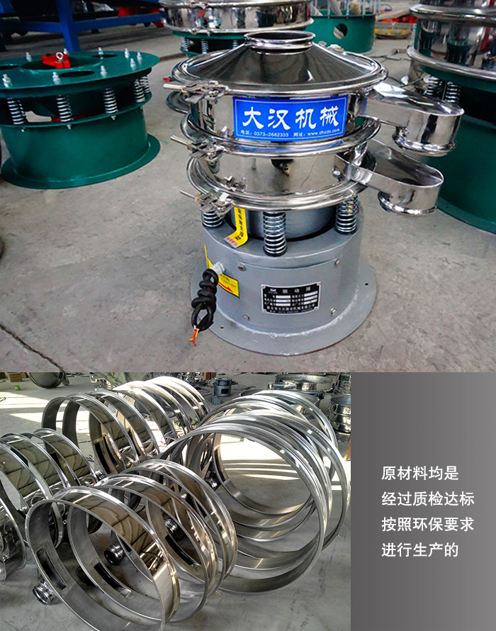 不銹鋼旋振篩作為機械設備,優(yōu)質(zhì)的材質(zhì)才能打造出更耐磨、更高質(zhì)的設備。大漢不銹鋼旋振篩原材料均是經(jīng)過質(zhì)檢達標,按照要求進行生產(chǎn)的,大漢在原材料選取方面絕不含糊,杜絕一切偷工減料行為。